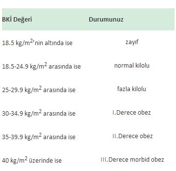 Obezitenin değerlendirilmesinde en sık kullanılan hesaplama Beden Kitle İndeksi (BKİ) ‘dir (Tablo-1). BKI kilogram olarak ağırlığın, metre cinsinden boy uzunluğunun karesine bölünmesiyle elde edilir. Bu sonuca göre 30’un üzerinde olan birey obez, 40’ın üzerinde olan birey ise morbid obez olarak adlandırılır.